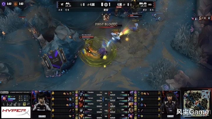 整场看下来,北川绝对是BLG里,最尽力的那个人,第一局刚上来,北川就3级抓下,成功帮ELK拿下一血,紧接着去上路抓死圣枪哥,给Bin也拿了一个头,中期配合沙皇抓岩雀,又给Knight拿了个头,三C三个人头开局,结果决胜团,妮蔻大5个,沙皇推5个的情况下,ELK向前闪送了。
